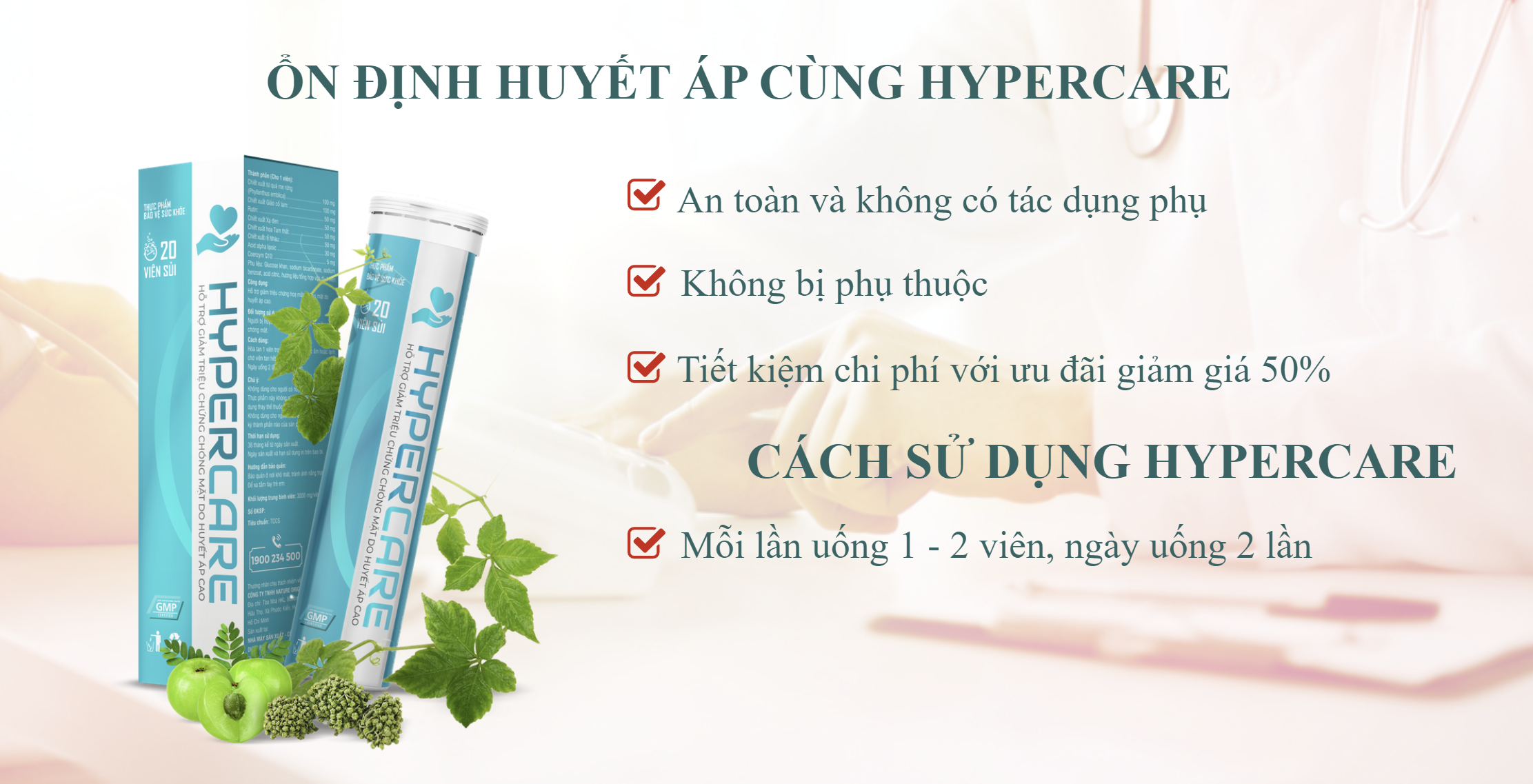 Hypercare là thực phẩm chức năng dành cho người có biểu hiện tăng huyết áp như đau đầu, chóng mặt, hồi hộp, tim đập nhanh. Hypercare được sản xuất dưới dạng viên sủi, mỗi hộp 20 viên.