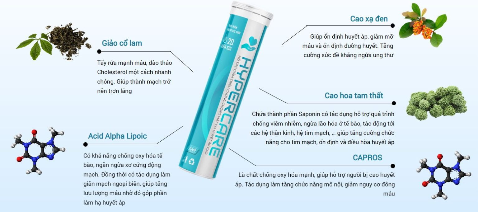 Viên sủi Hypercare chứa các thành phần tự nhiên như Capros, Acid Alpha Lipoic, cây xạ đen, chiết xuất hoa tam thất và cao Giảo cổ lam. Các thành phần này có khả năng hỗ trợ giảm tình trạng huyết áp cao và cải thiện sức khỏe tim mạch hiệu quả.