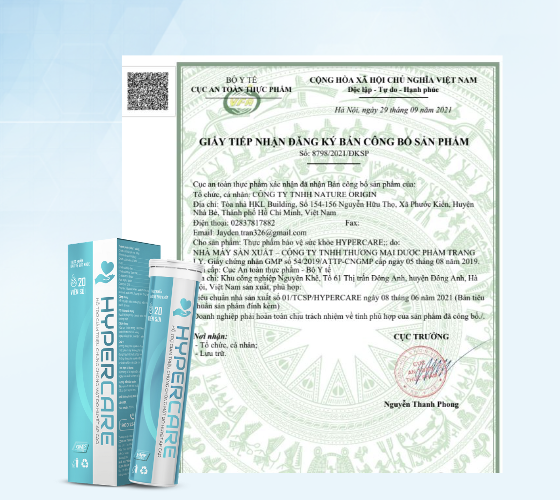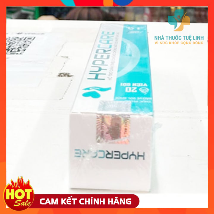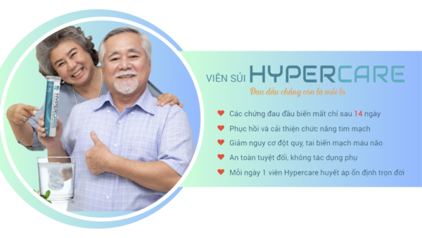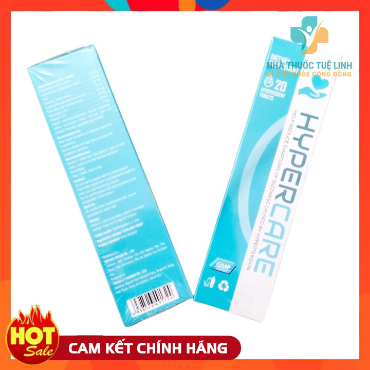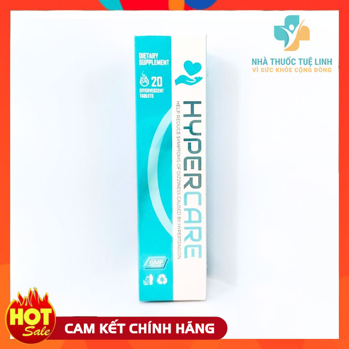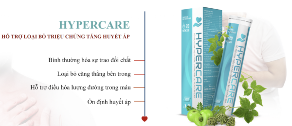 Hypercare là thực phẩm chức năng dành cho người có biểu hiện tăng huyết áp như đau đầu, chóng mặt, hồi hộp, tim đập nhanh. Hypercare được sản xuất dưới dạng viên sủi, mỗi hộp 20 viên.